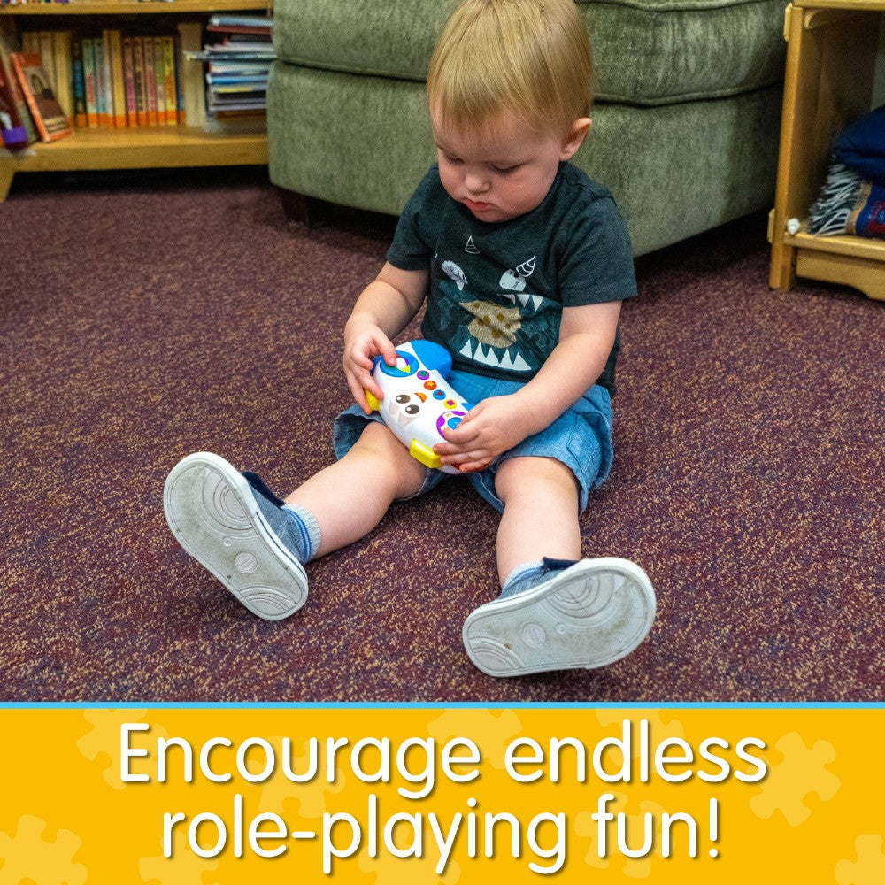 Encourage Role-Play With On The Go Game Controller! Babies & Toddlers Can Now Join In The Gaming Fun With The On The Go Game Controller. Put Big Fun In Your Little One’s Hands With A Game Controller That Looks Like The Ones Bigger Kids Use! This Controller Has Multiple Buttons, Roller Balls, And More That Play Sounds And Music And Introduce Numbers, Colours, Shapes, & More! Plays Delightful Melodies, Includes A Light-Up LED, Sensory Activities, Automatic Shut-Off Function & Is Battery Operated.
